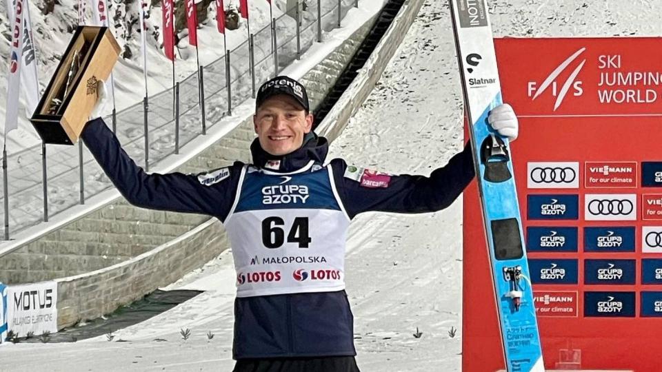 Slovenski smučarski skakalec Anže Lanišek (278,1 točke) je v težkih razmerah in močnem sneženju v poljskih Zakopanah prepričljivo ugnal konkurenco in slavil tretjo zmago v svetovnem pokalu to sezono. Devetindvajsetletnik je bil po prvi seriji drugi, v finalu pa je krepko preskočil konkurenco. Domen Prevc (204) kljub 27. mestu ostaja v rumenem.