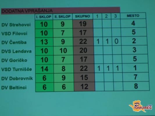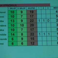 Po obeh sklopih vprašanj sta največ znanja pokazali ekipa Društva vinogradnikov Čentiba in ekipa Vinogradniško sadjarskega društva Turnišče, ki sta zbrali 22 točk. O zmagovalcu je odločal še tretji sklop dodatnih vprašanj.