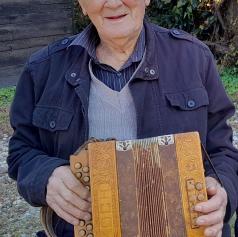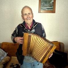 Kljub starosti še vedno raztegne meh svoje harmonike.