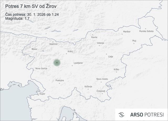 V noči na petek je območje severovzhodno od Žirov stresel šibek potres. Seizmografi državne mreže potresnih opazovalnic so v petek, 30. januarja 2026, ob 1.24 zaznali potres magnitude 1,7 z nadžariščem približno 7 kilometrov severovzhodno od Žirov.