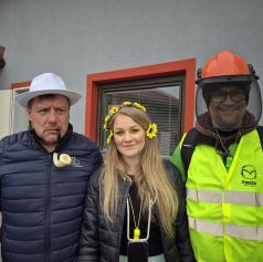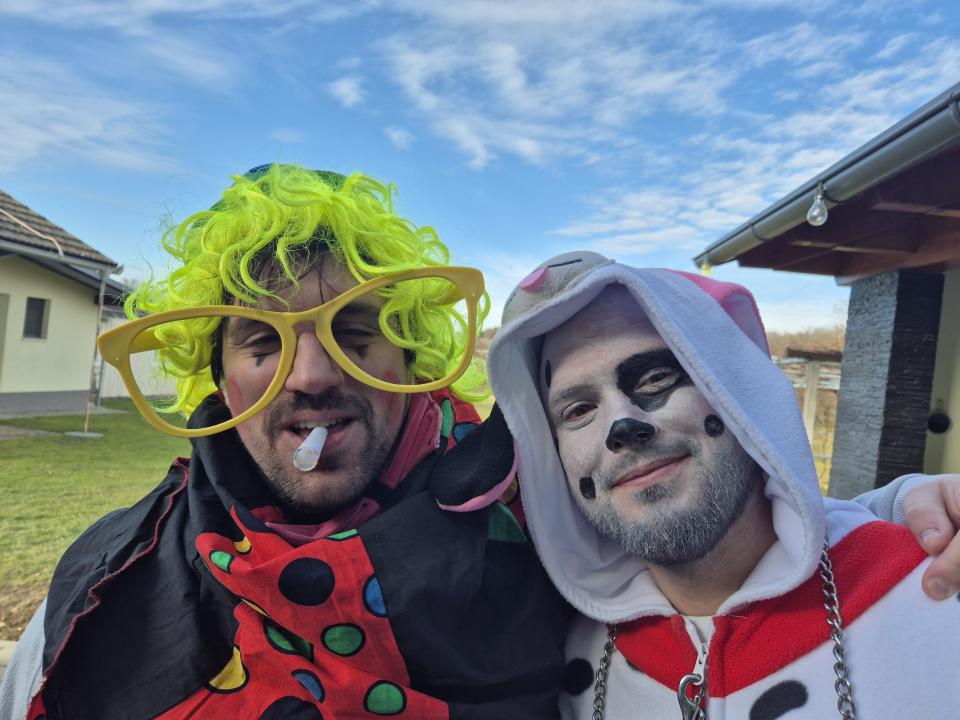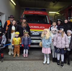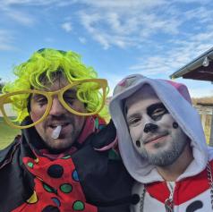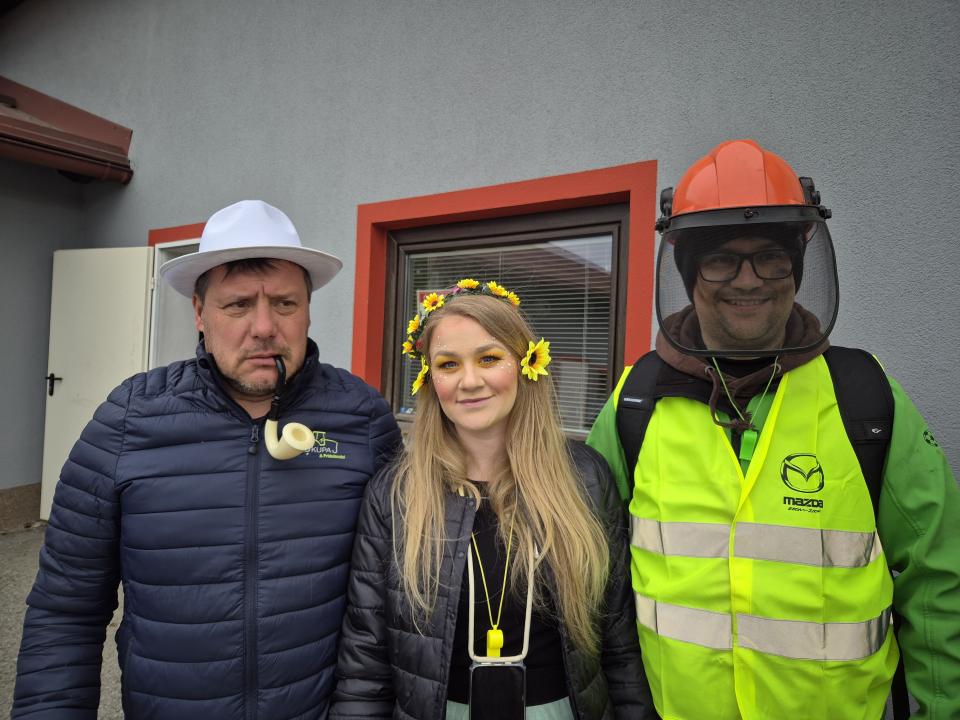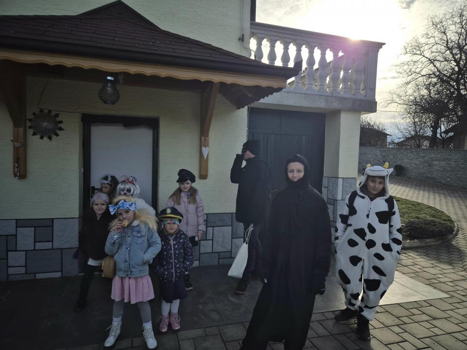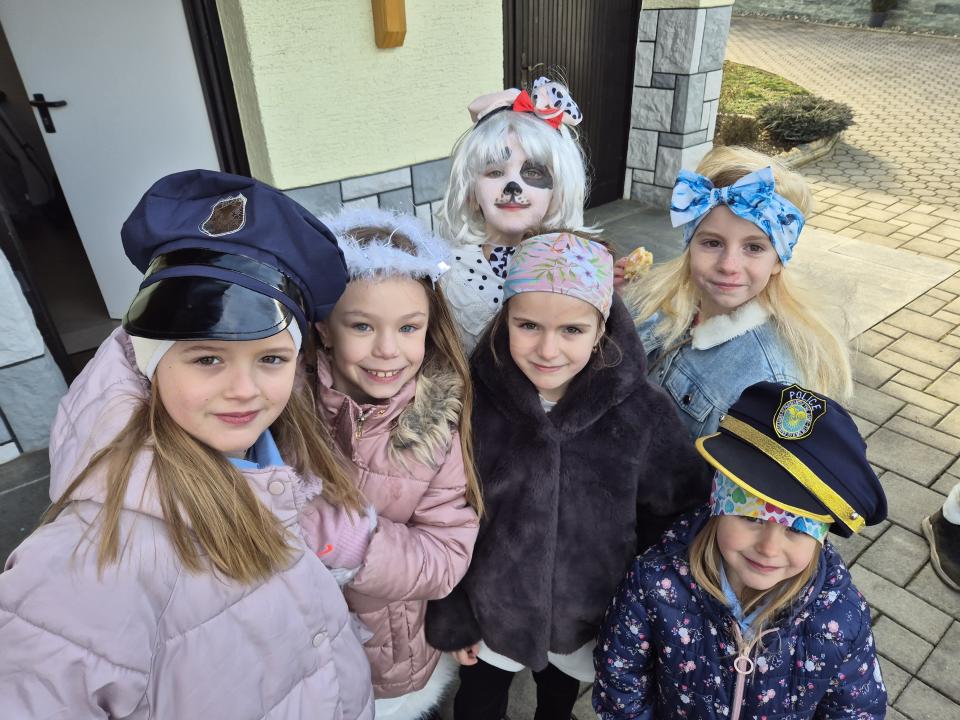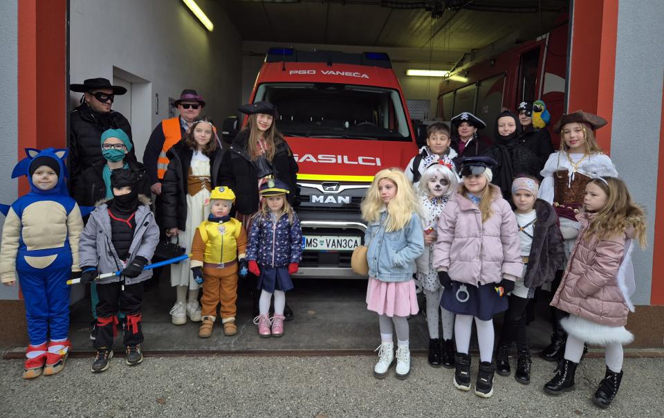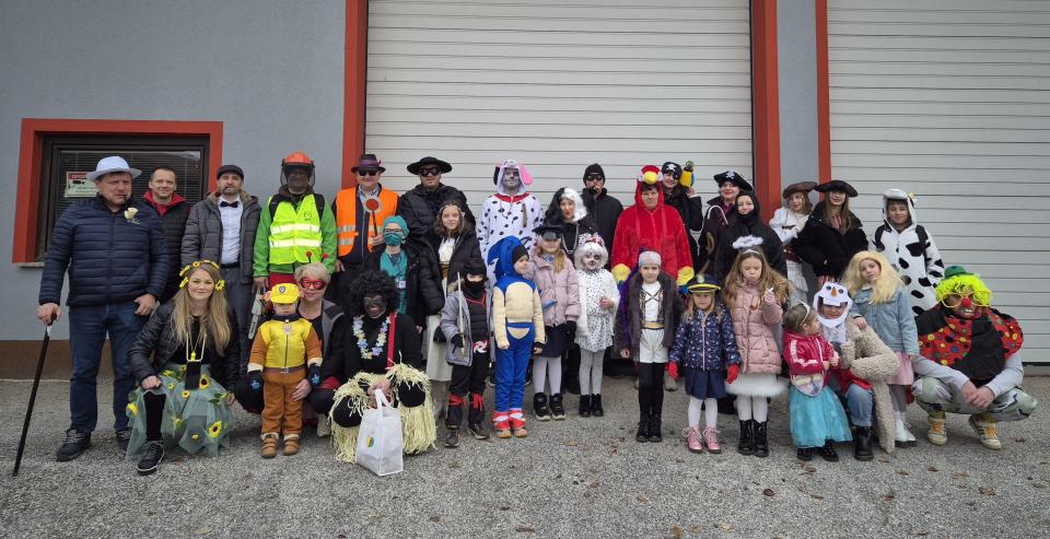 Letošnje pustovanje pa je imelo še posebno iskrico – prvo skupinsko fotografiranje ob novi pridobitvi kraja, gasilskem kombiju, ki bo uradno predan namenu 23. maja 2026.