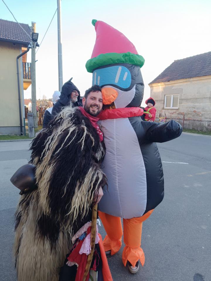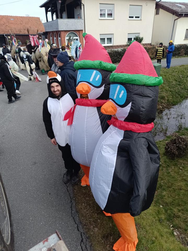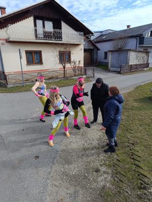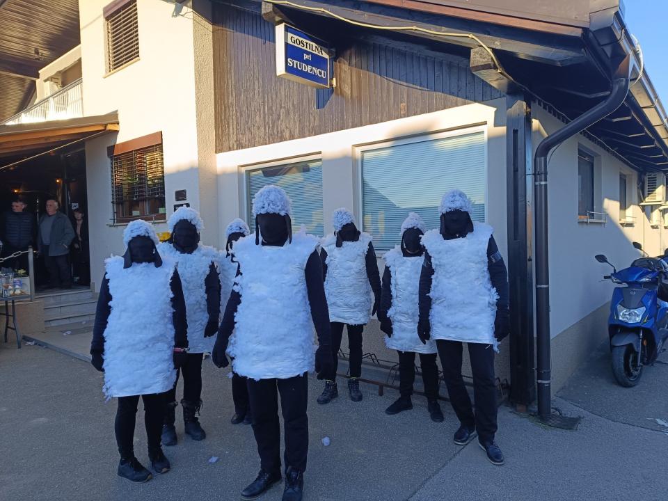 Pustno rajanje se je nadaljevalo pred Gostilno pri Studencu, kjer so se maškare še dolgo veselile ob glasbi, plesu in druženju.
