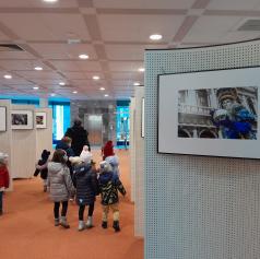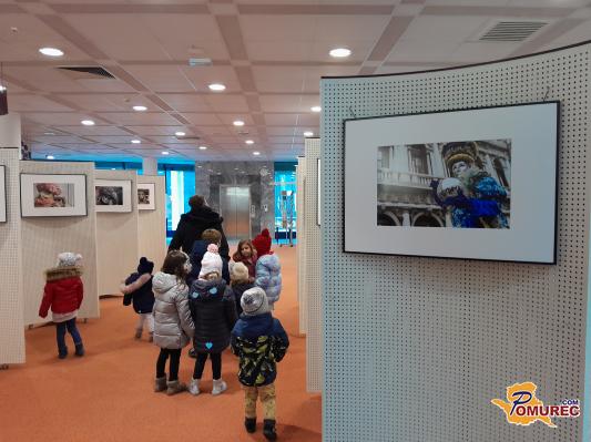 Razstava fotografij z naslovom »Beneške maske« je postavljena na panojih.