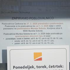 Ob tem se s 1. marcem 2026 spreminja tudi delovni čas poslovalnice v Murski Soboti. Poslovalnica Murska Sobota bo od 1. 3. 2026 dalje poslovala po spremenjenem delovnem času. Ob ponedeljkih, torkih in četrtkih bo odprta od 8. do 12. ure in od 13. do 16. ure, ob sredah od 8. do 12. ure in od 13. do 17. ure, ob petkih pa od 8. do 12. ure in od 13. do 15. ure.