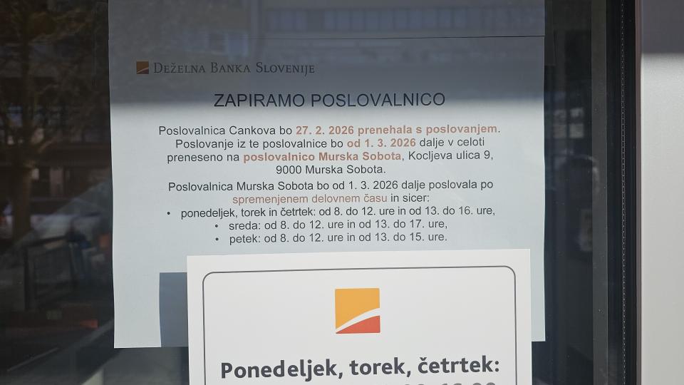 Deželna banka Slovenije bo konec februarja zaprla svojo poslovalnico v Cankovi. Kot izhaja iz obvestila, bo poslovalnica Cankova 27. 2. 2026 prenehala s poslovanjem.