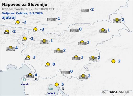 Današnja sreda bo v Sloveniji prinesla deloma sončno, a nekoliko spremenljivo vreme. Dopoldne bo še precej jasno, marsikje po nižinah pa bo prisotna megla, ki se bo najdlje zadrževala ob morju. Čez dan se bo oblačnost povečala, predvsem v notranjosti države pa lahko nastane tudi nekaj kratkotrajnih ploh.