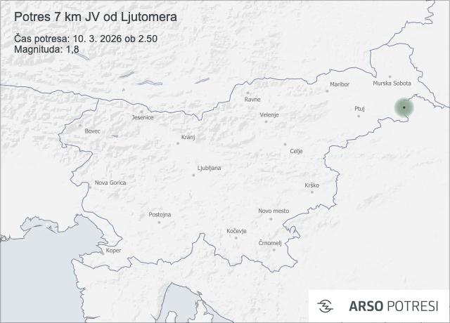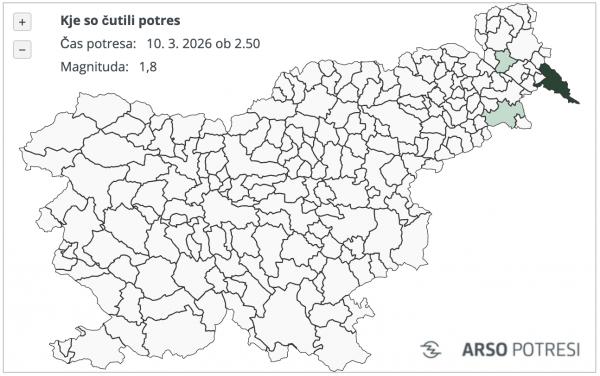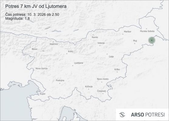 Seizmografi so danes ponoči zabeležili šibek potres v bližini Ljutomera. Po prvih podatkih je bilo nadžarišče približno 7 kilometrov jugovzhodno od Ljutomera, tresenje tal pa je nastopilo 10. marca 2026 ob 2.50 po lokalnem času.