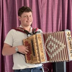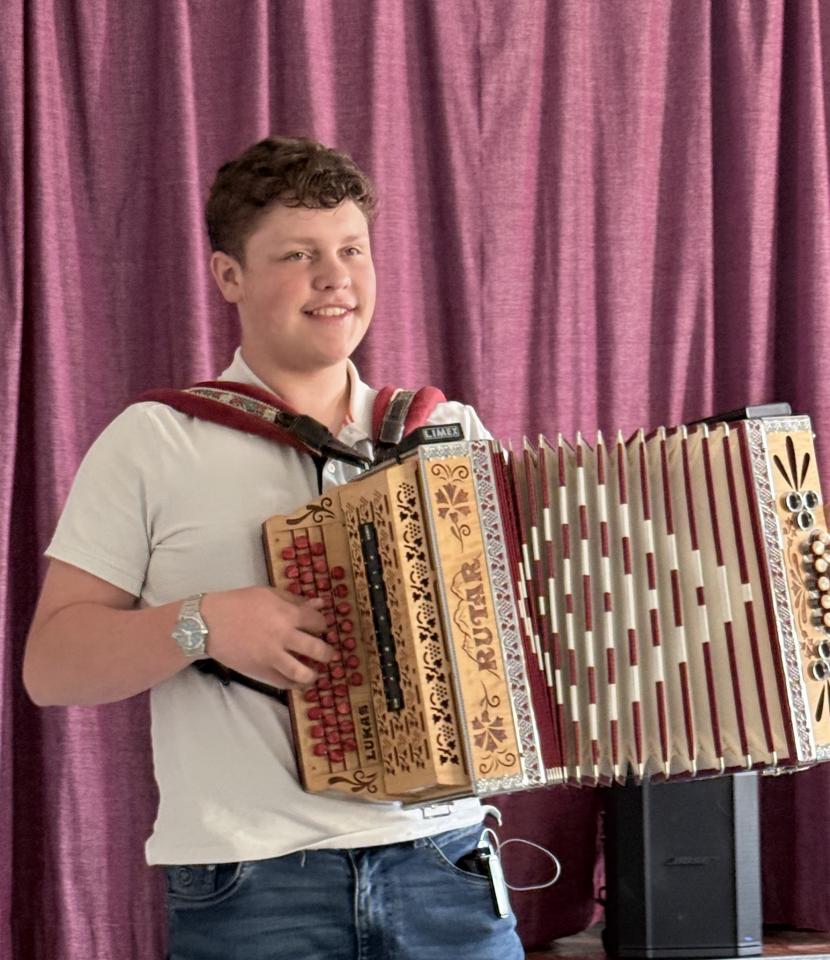 Posebno vzdušje je s harmoniko pričaral Lukas Gumilar, katerega melodije so se prepletale s pripovedovanjem in večeru dodale občutek topline ter domačnosti.