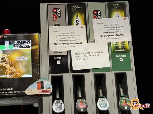 Na servisih družbe Mol po državi lahko posamezne fizične osebe natočijo največ 30 litrov goriva, pravne osebe oziroma vozniki tovornjakov pa do 200 litrov. Kot so za STA pojasnili v družbi Mol Slovenija, so se za omejitev odločili, da preprečijo prevelik pritisk na bencinske servise in morebitne motnje v oskrbi. Ob tem poudarjajo, da želijo vsem strankam zagotoviti enakovreden dostop do goriva. Ukrep je začasen, poroča STA.