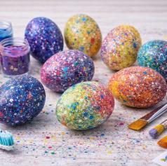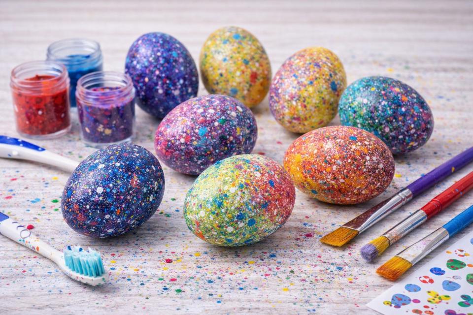 Barvo razredčite z malo vode, nato pa z zobno ščetko ali čopičem poškropite jajca. Če uporabite več barv, dobite dinamičen, skoraj "galaktičen" videz, kjer se barve prekrivajo in ustvarjajo zanimive kontraste.