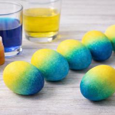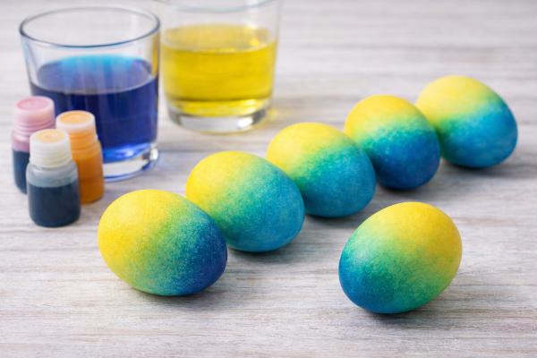 Jajce najprej pobarvate v svetlejši barvi, na primer rumeni, ga posušite in nato delno ali v celoti potopite v temnejšo barvo, na primer modro. Tako nastanejo zanimivi prehodi in novi odtenki, na primer zelena.