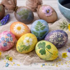 Na jajce položite majhne liste, cvetove ali travo, nato ga ovijete v tanko tkanino ali nogavico in potopite v barvo ali kuhate v naravnem barvilu. Ko odstranite rastlinski material, ostane na jajcu jasen in zelo dekorativen odtis.