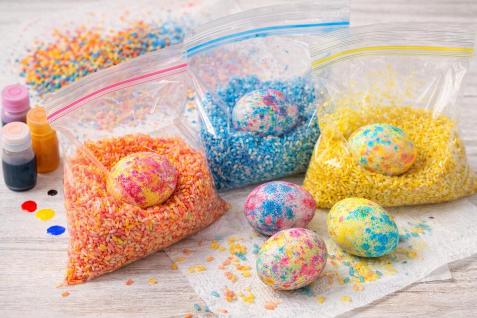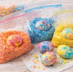 V plastično vrečko ali posodo nasujete riž, dodate nekaj kapljic barve in dobro premešate. Nato dodate jajce in vrečko nežno stresate, da se barva oprime lupine. Rezultat je zanimiv pikast vzorec, ki ga lahko nadgradite z več barvami.
