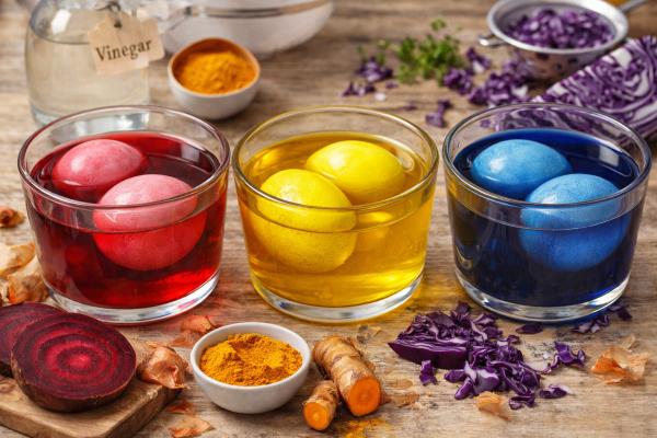 Tretji način vključuje naravna barvila iz rastlin. Rdeča pesa ustvari rožnate odtenke, kurkuma daje rumeno barvo, rdeče zelje pa modro-vijolične tone. Sestavine narežete, jih kuhate v vodi približno 30 minut, nato tekočino precedite in vanjo dodate malo kisa. Jajca lahko v tej tekočini pustite več ur ali celo čez noč za bolj izrazite barve.