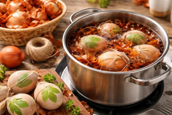 Barvanje z olupki čebule je ena najbolj tradicionalnih tehnik pri nas. Suhe olupke rjave ali rdeče čebule položite v lonec z vodo, dodate jajca in vse skupaj kuhate približno 10 minut. Če želite vzorce, na jajce položite listič ali travo, ga ovijete v tanko nogavico in nato kuhate. Po odstranitvi se pokaže lep naravni odtis.