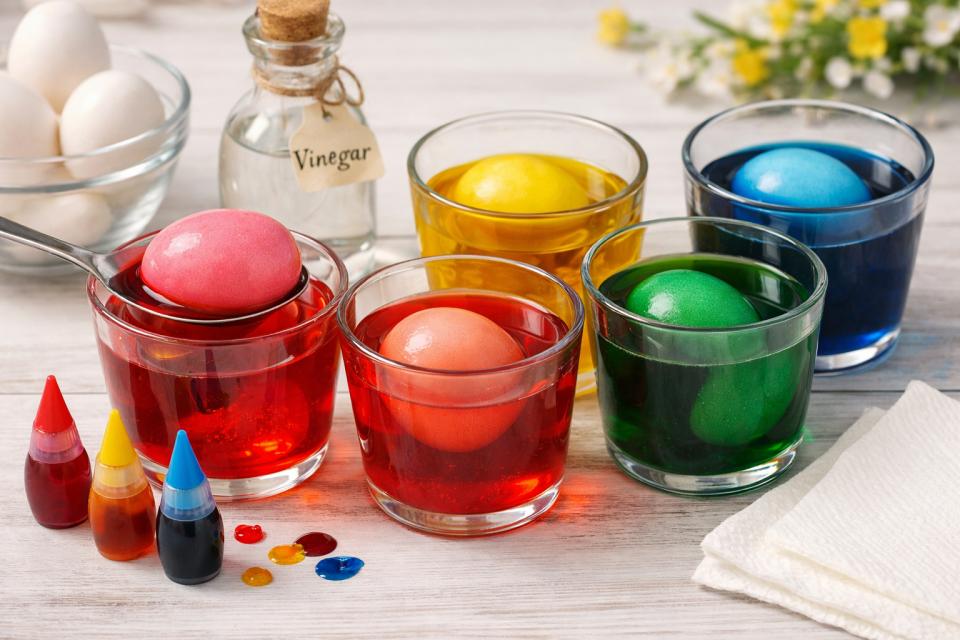 V skodelico zmešate približno pol litra tople vode, eno žlico kisa in nekaj kapljic jedilne barve. Kis pomaga, da se barva bolje oprime lupine. Trdo kuhana jajca nato potopite v raztopino za 5 do 15 minut. Če želite intenzivnejšo barvo, jih pustite dlje časa ali uporabite več barvila.