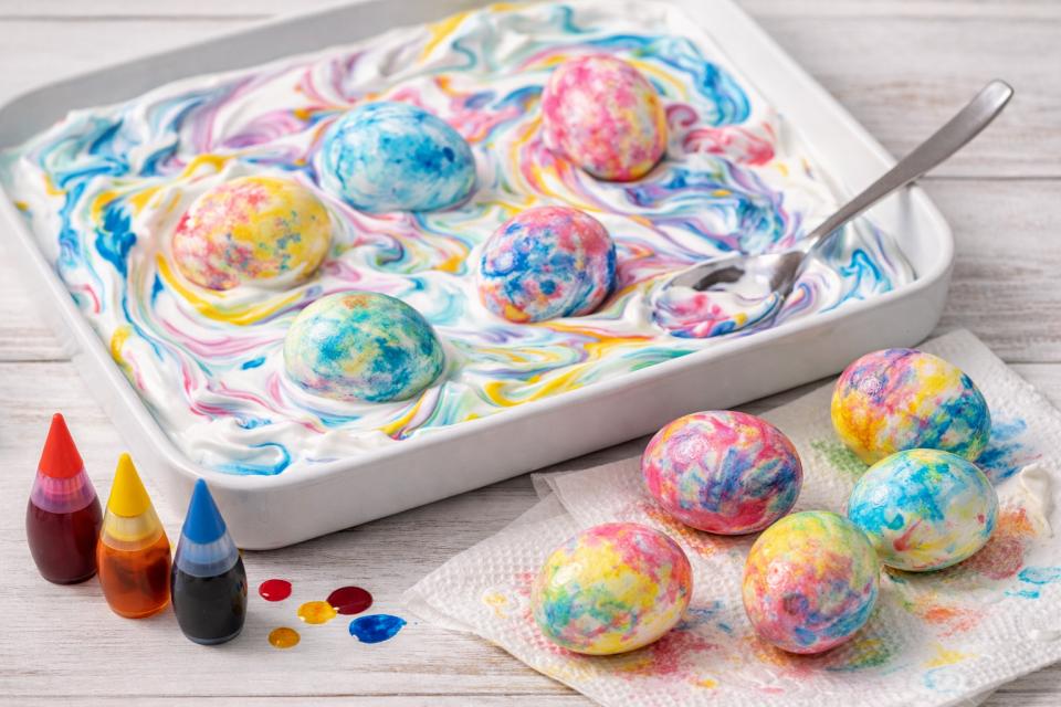 Marmorni učinek lahko ustvarite s peno za britje ali sladko smetano. Na pladenj nanesete plast pene, po njej nakapate različne barve in jih rahlo premešate. Jajce povaljate po površini, ga pustite nekaj minut, nato pa nežno obrišete. Nastanejo mehki, prelivajoči se vzorci.