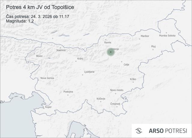 Danes dopoldne so tla rahlo zatresla v bližini Topolšice. Po podatkih seizmologov je bil potres zabeležen ob 11.17, njegovo žarišče pa je bilo približno štiri kilometre jugovzhodno od kraja.