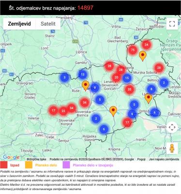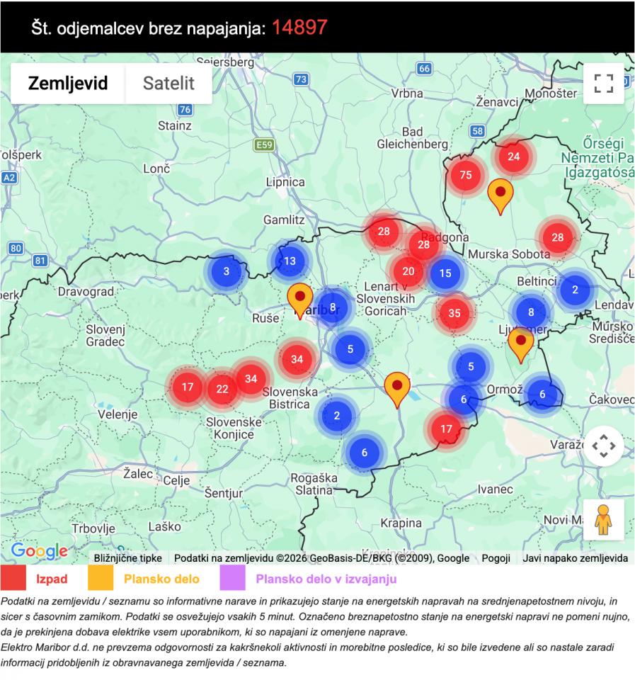 Na območju Elektra Maribor je prišlo do obsežnih motenj v oskrbi z električno energijo. Po zadnjih podatkih je brez napajanja kar 14.897 odjemalcev, kar kaže na širši in razpršen problem na severovzhodu države.