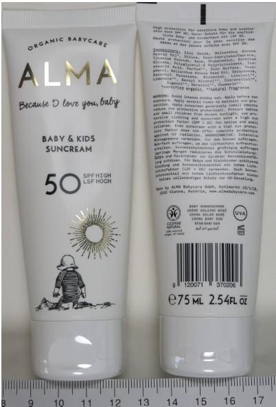 Zdravstveni inšpektorat Republike Slovenije je preko sistema Safety Gate obvestil javnost o odpoklicu izdelka krema za sončenje za dojenčke in otroke Alma Organic Babycare SPF 50.