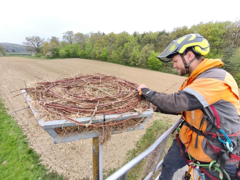 Zato so gnezdo pripravili tako, da čim bolj posnema naravne razmere. Spleteno je iz vej iz vinograda in sena, kar naj bi povečalo verjetnost, da ga štorklje prepoznajo kot primerno za gnezdenje.